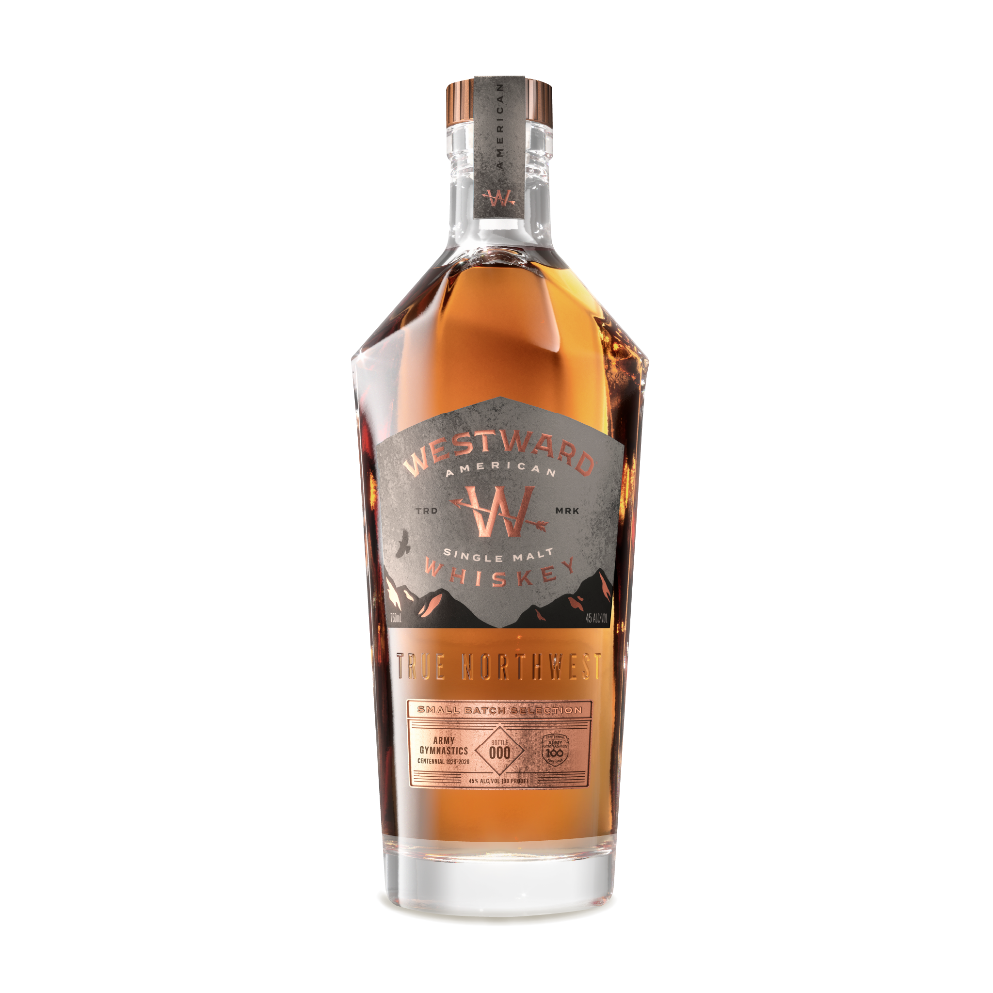 The result is the same robust, balanced whiskey that defines Westward—showcasing the full spectrum of malt flavor, from bright fruit to warm spice to rich, toasted oak—presented with a custom label commemorating the Army Gymnastics Team Centennial. This limited release celebrates a century of strength, precision, and perseverance.